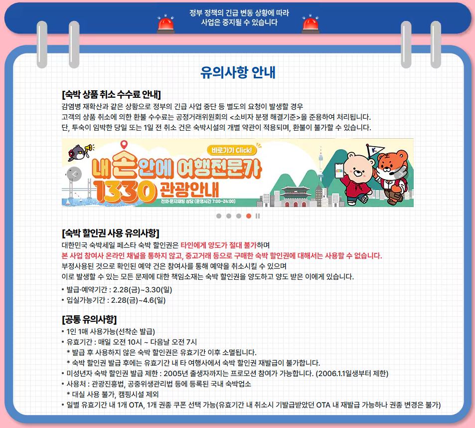 - 적용 숙소: 호텔, 리조트, 펜션 등 (미등록 숙박업소, 대실 예약 제외)