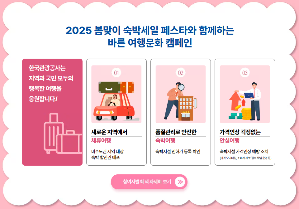 따스한 봄바람 따라 떠나고 싶은 마음, 2025 봄 숙박세일페스타가 응원합니다! 2월 28일부터 4월 6일까지, 국내 숙박 최대 3만 원 할인 혜택을 놓치지 마세요. 벚꽃 명소부터 숨겨진 여행지까지, 숙박비 부담 없이 봄 여행을 만끽할 수 있는 절호의 기회! 지금부터 숙박세일페스타의 모든 것을 파헤쳐 보겠습니다.