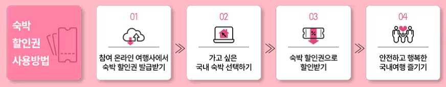 - 신청 방법: 야놀자, 여기어때, G마켓, 네이버 예약 등 42개 온라인 여행사 플랫폼에서 신청 가능 할인 신청